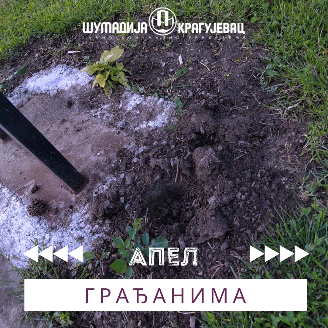 ЈКП Шумадија Крагујевац још једном апелује на суграђане да оваквим несaвесним поступцима не уништавају изглед зелених оаза града, јер поред причињене материјалне штете нарушавају и естетски изглед парка.