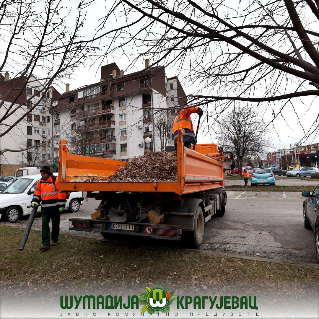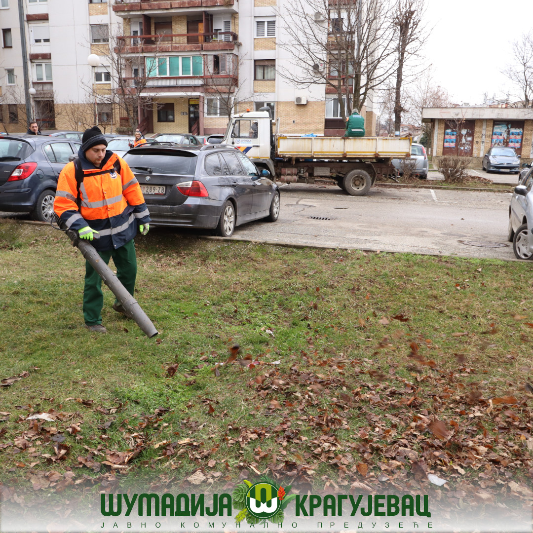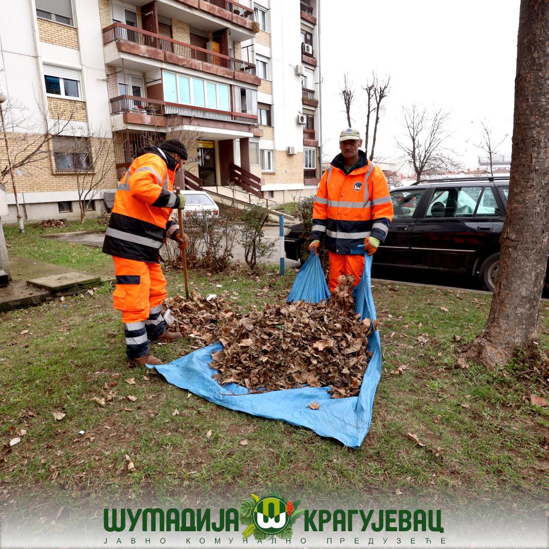 Sektor zelenilo JKP Šumadija Kragujevac u naselju Centralna radionica izvodi radove na grabuljanju i čišćenju lišća sa zelenih površina i iz žive ograde.
