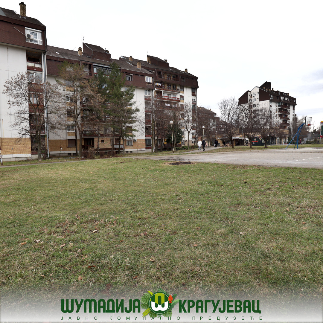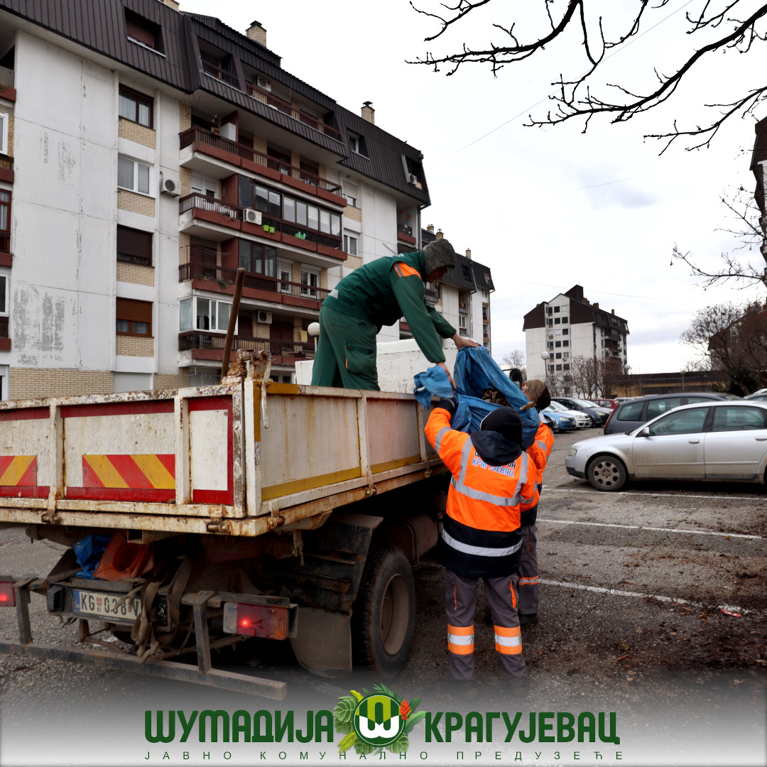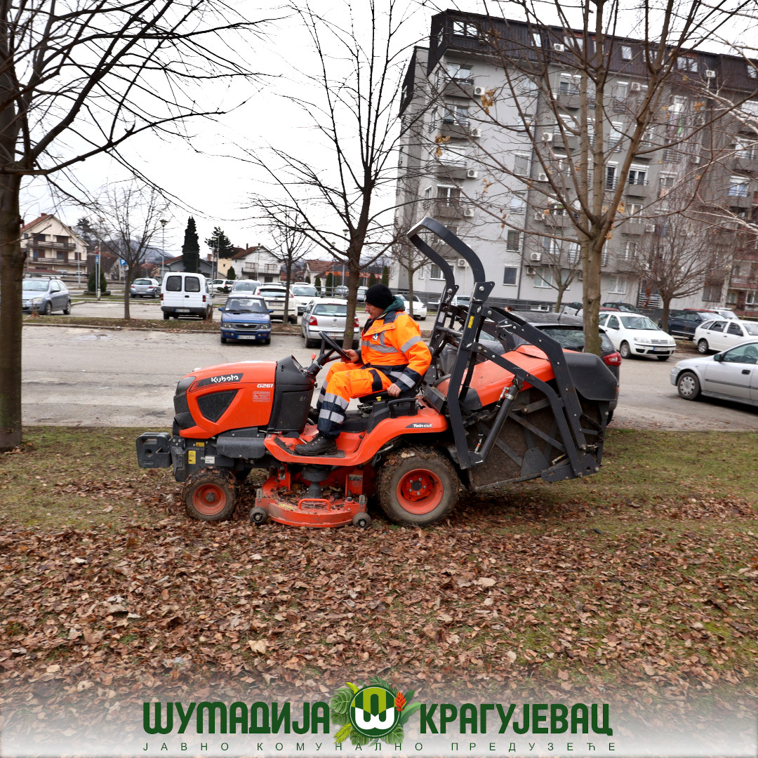 Sektor zelenilo JKP Šumadija Kragujevac u naselju Centralna radionica izvodi radove na grabuljanju i čišćenju lišća sa zelenih površina i iz žive ograde.