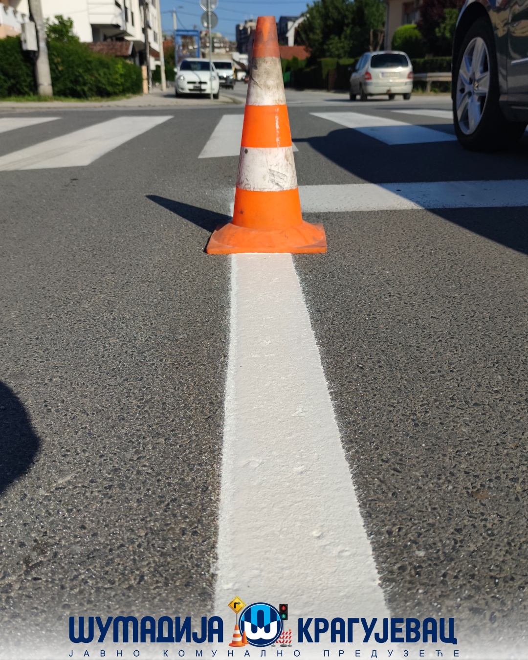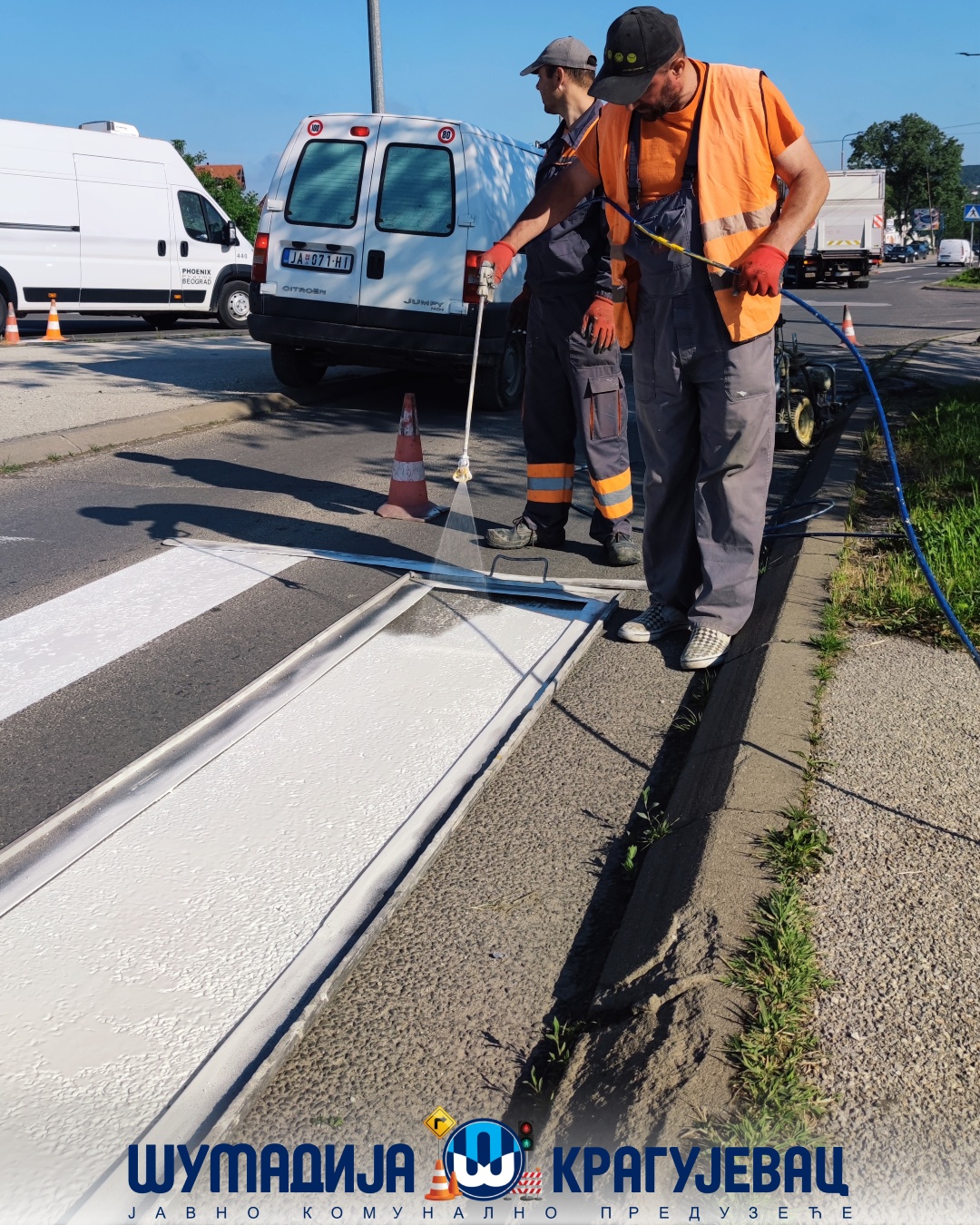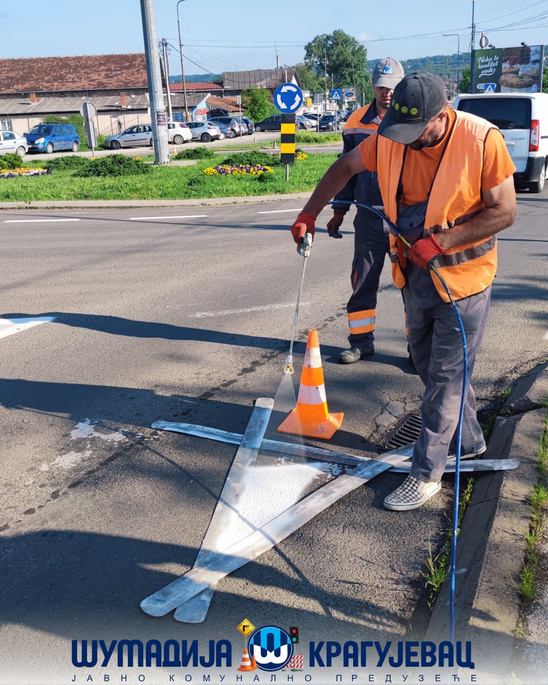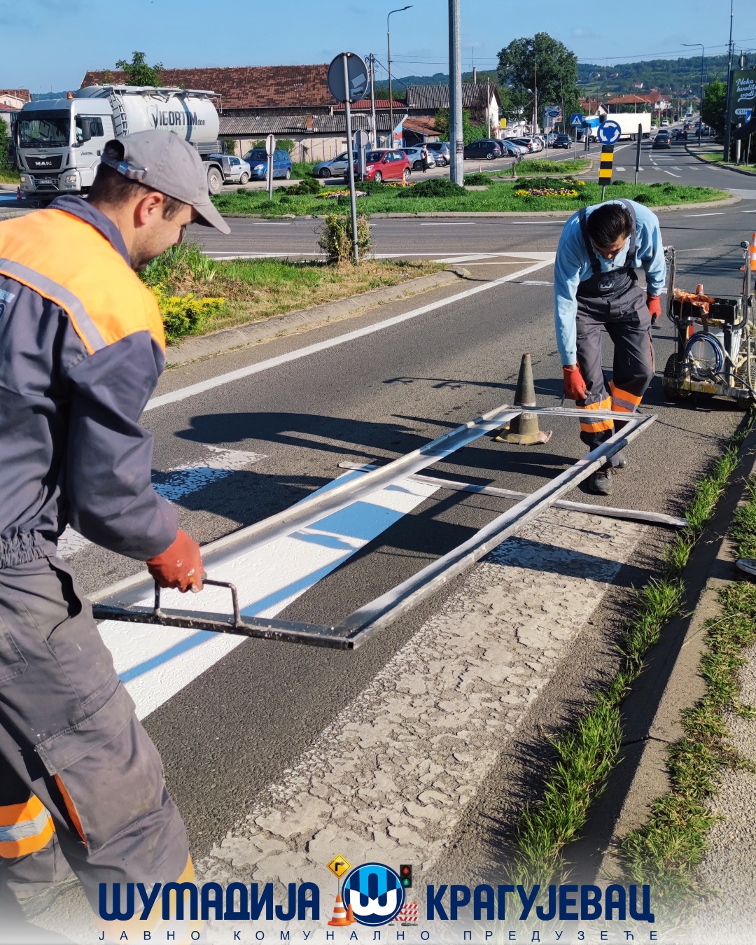 Služba signalizacije JKP Šumadija Kragujevac koristi povoljne vremenske uslove za obeležavanje horizontalne signalizacije na teritoriji grada. Danas se izvode radovi na obeležavanju pešačkih prelaza i drugih oznaka na kolovozu u ulici Internacionalnih brigada, a sa radovima se nastavlja i u ulicama Slobode, Dragana Panića i Dr Bore Evtova gde ekipe izvode radove na obeležavanju središnjih i razdelnih linija.