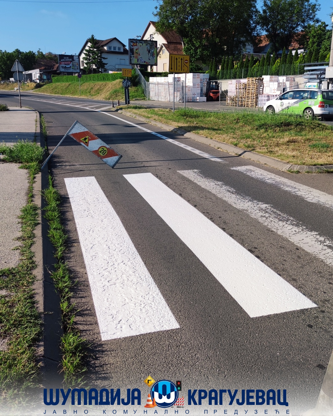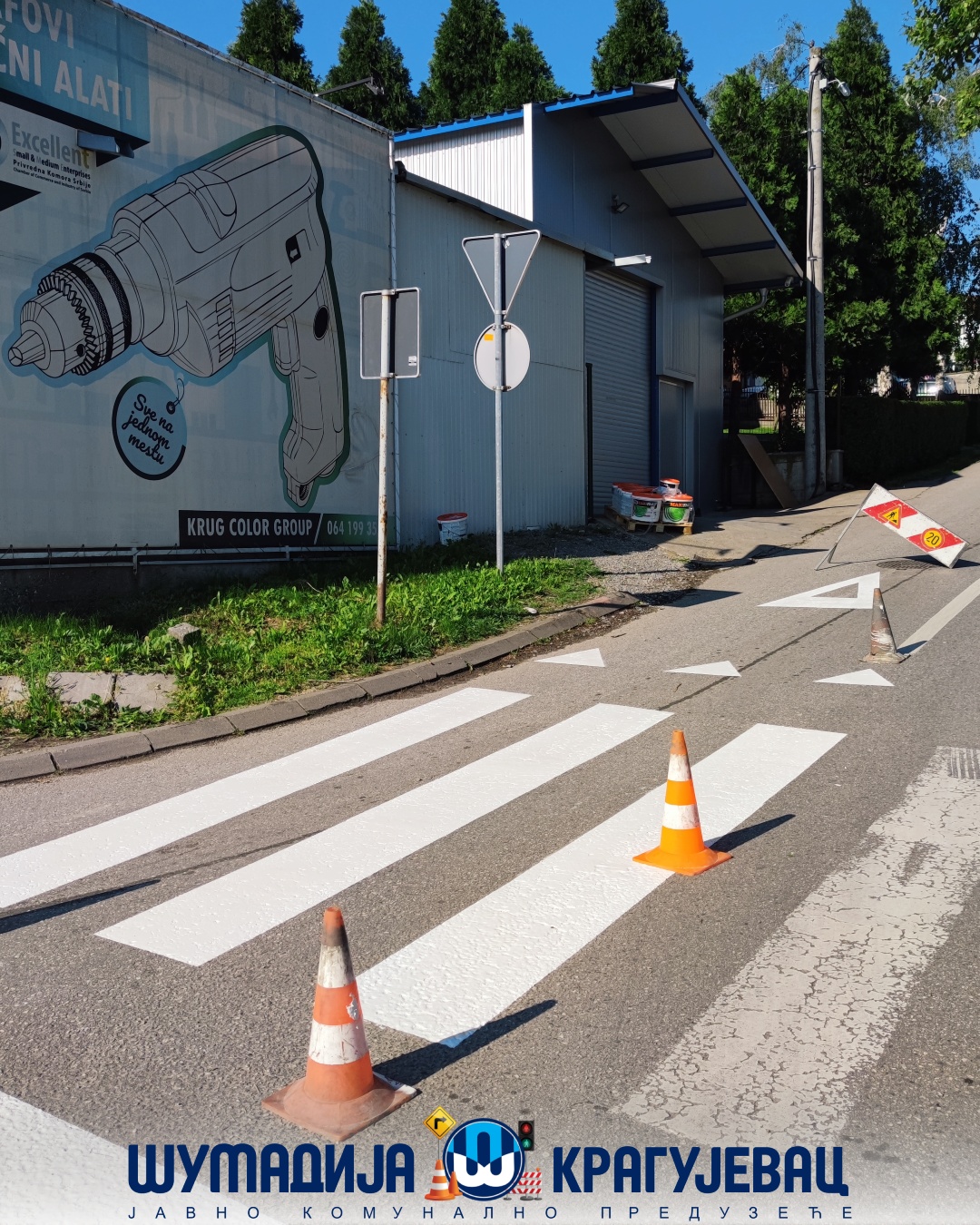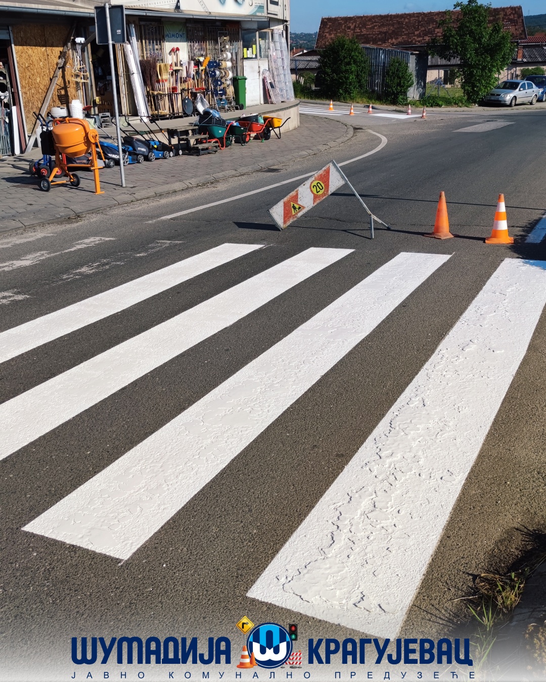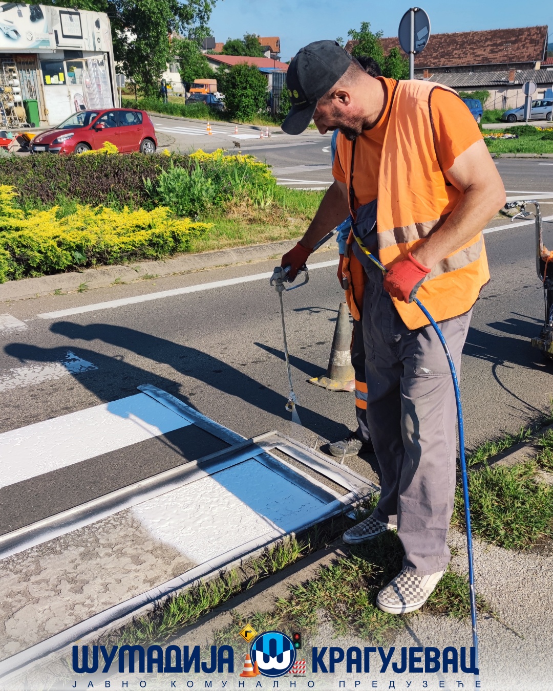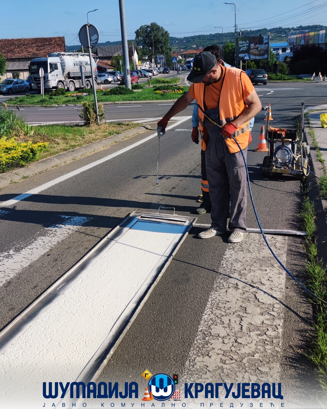 Služba signalizacije JKP Šumadija Kragujevac koristi povoljne vremenske uslove za obeležavanje horizontalne signalizacije na teritoriji grada. Danas se izvode radovi na obeležavanju pešačkih prelaza i drugih oznaka na kolovozu u ulici Internacionalnih brigada, a sa radovima se nastavlja i u ulicama Slobode, Dragana Panića i Dr Bore Evtova gde ekipe izvode radove na obeležavanju središnjih i razdelnih linija.