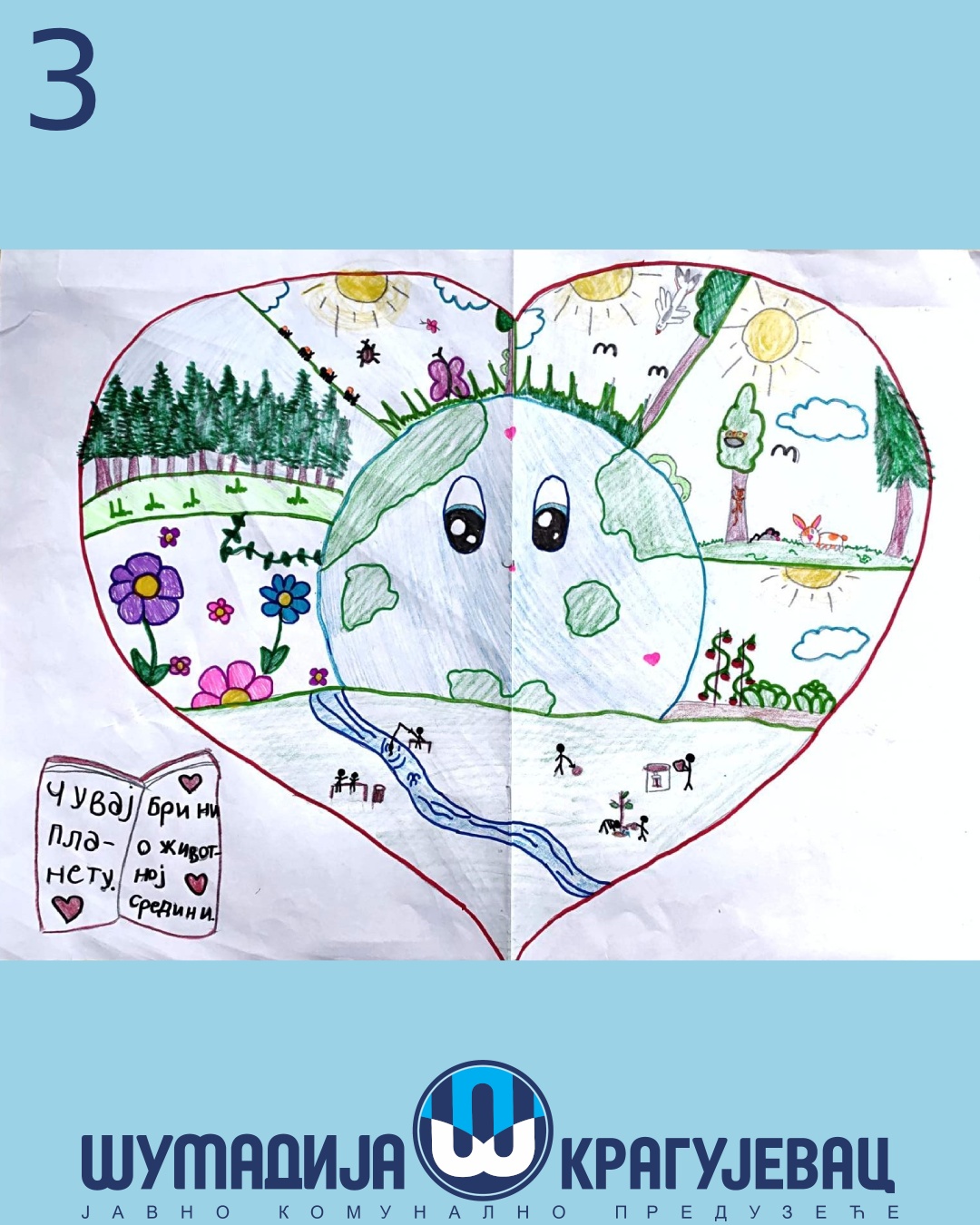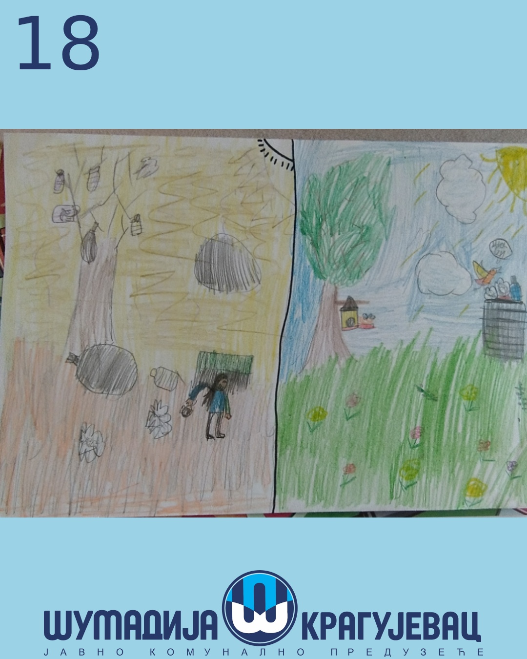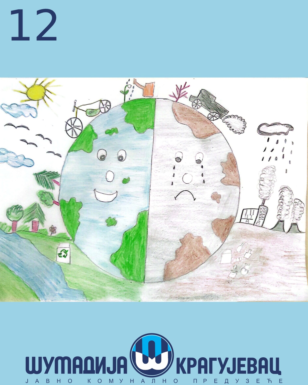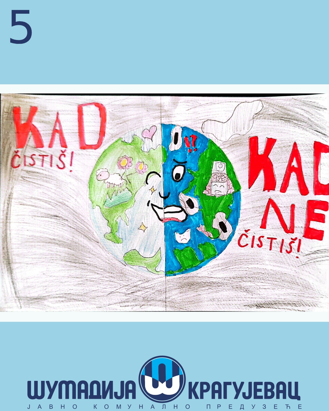 Na likovni konkurs koji je organizovalo JKP Šumadija Kragujevac u susret Svetskom danu zaštite životne sredine pristiglo je 18 radova, a učestvovali su učenici prvog i drugog razreda osnovnih škola u Kragujevcu.
