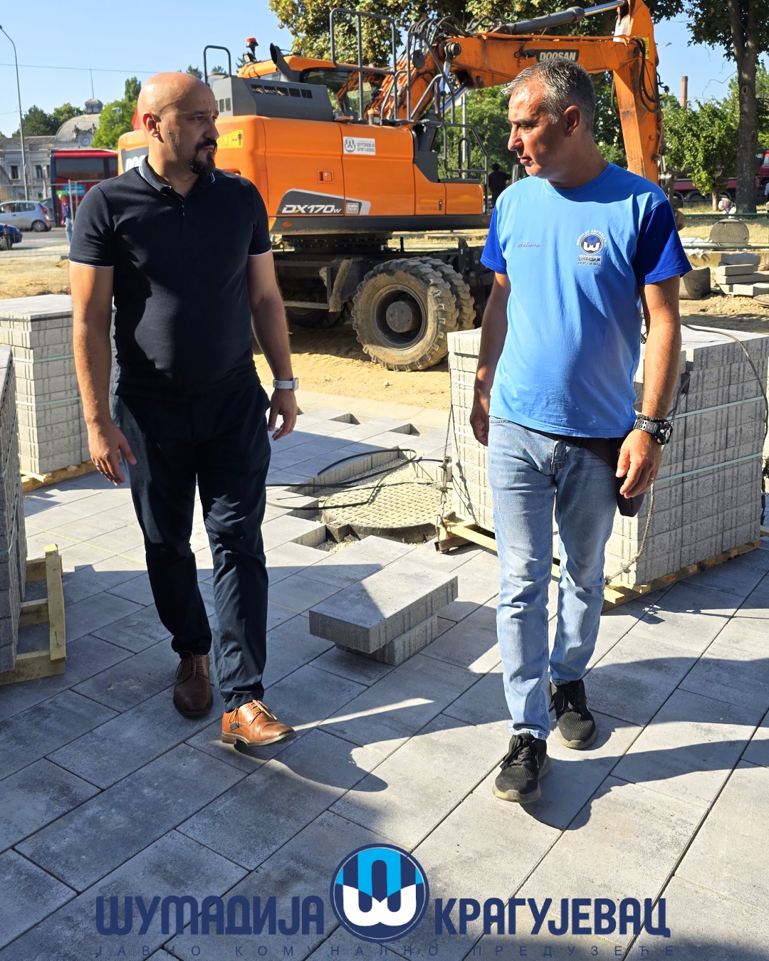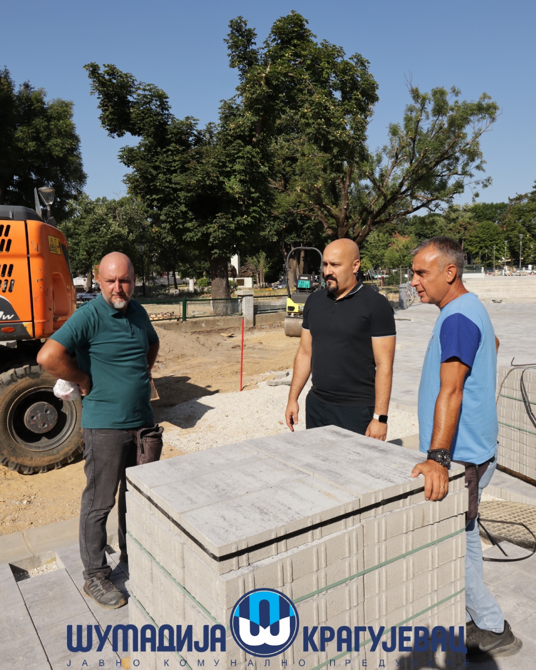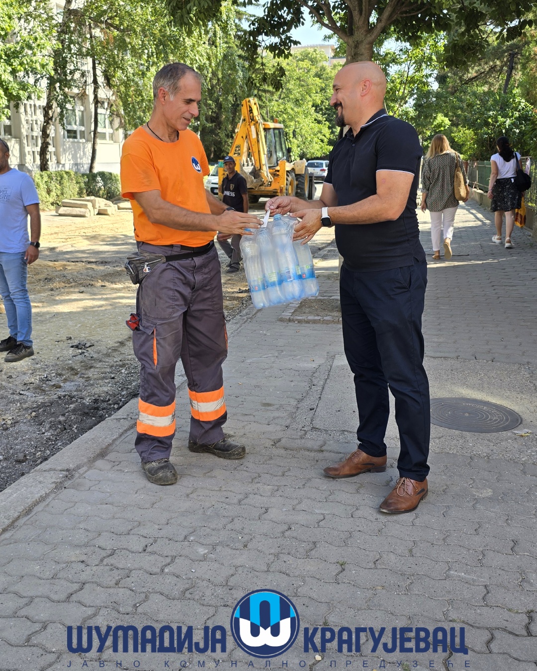Direktor JKP Šumadija Kragujevac, Miroslav Petrašinović obišao je danas radnike koji obavljaju poslove na otvorenom. Usled visokih dnevnih temperatura za njih je rad organizovan u dve smene – u ranim jutarnjim i popodnevnim časovima.