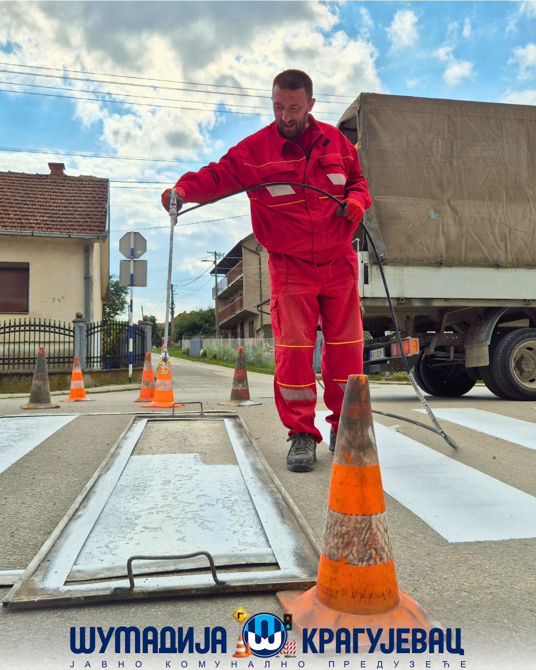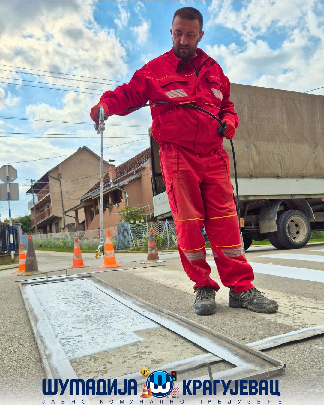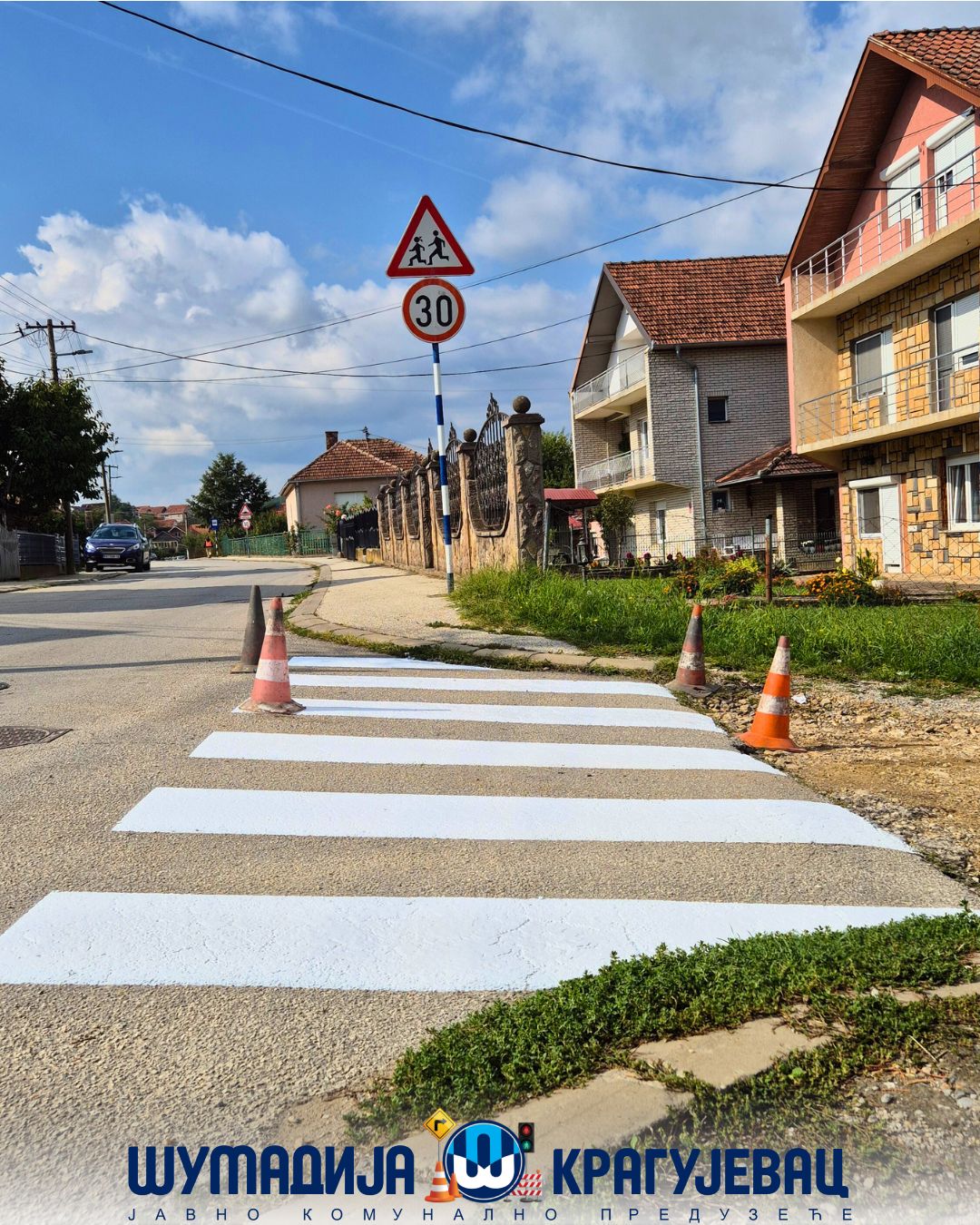 Služba signalizacije JKP Šumadija Kragujevac danas izvodi radove na obeležavanju horizontalne signalizacije u MZ Veliko Polje.