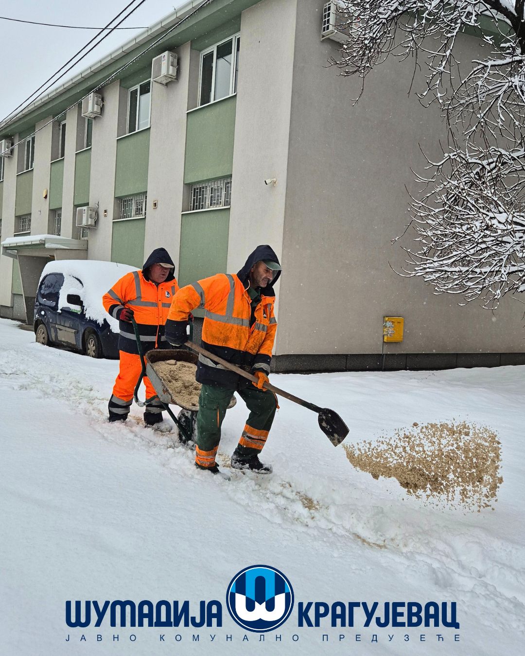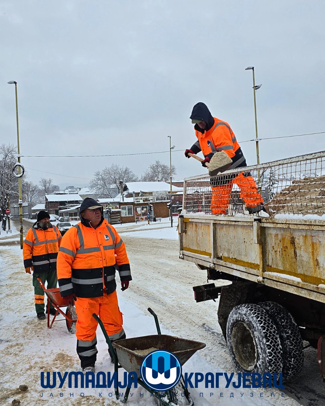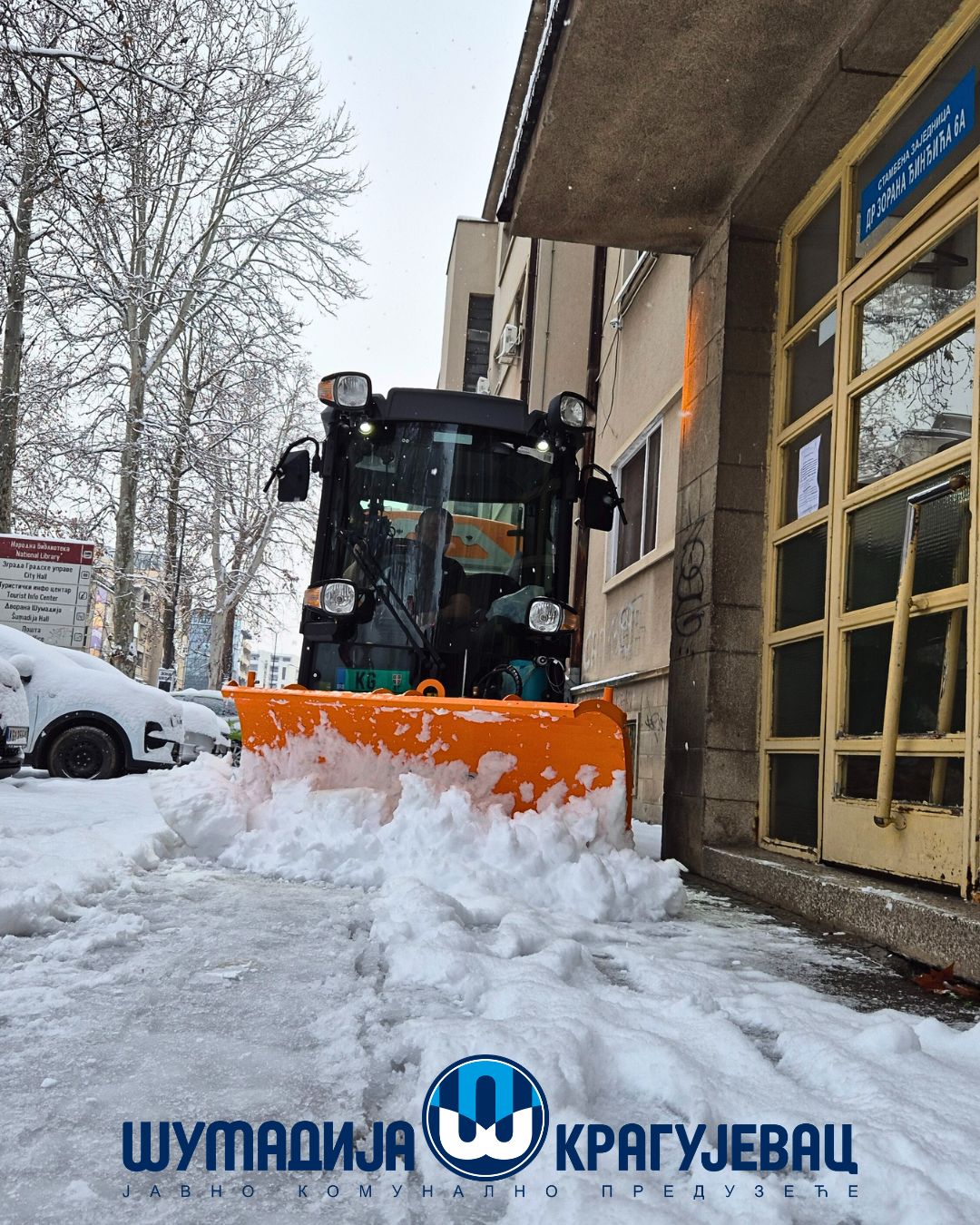 Zimska služba JKP Šumadija Kragujevac tokom noći i jutra angažovana je na obezbeđivanju prohodnosti saobraćajnica na gradskom i seoskom području, kao i na uklanjanju snega sa trotoara, nadvožnjaka, mostova i pešačkih staza.