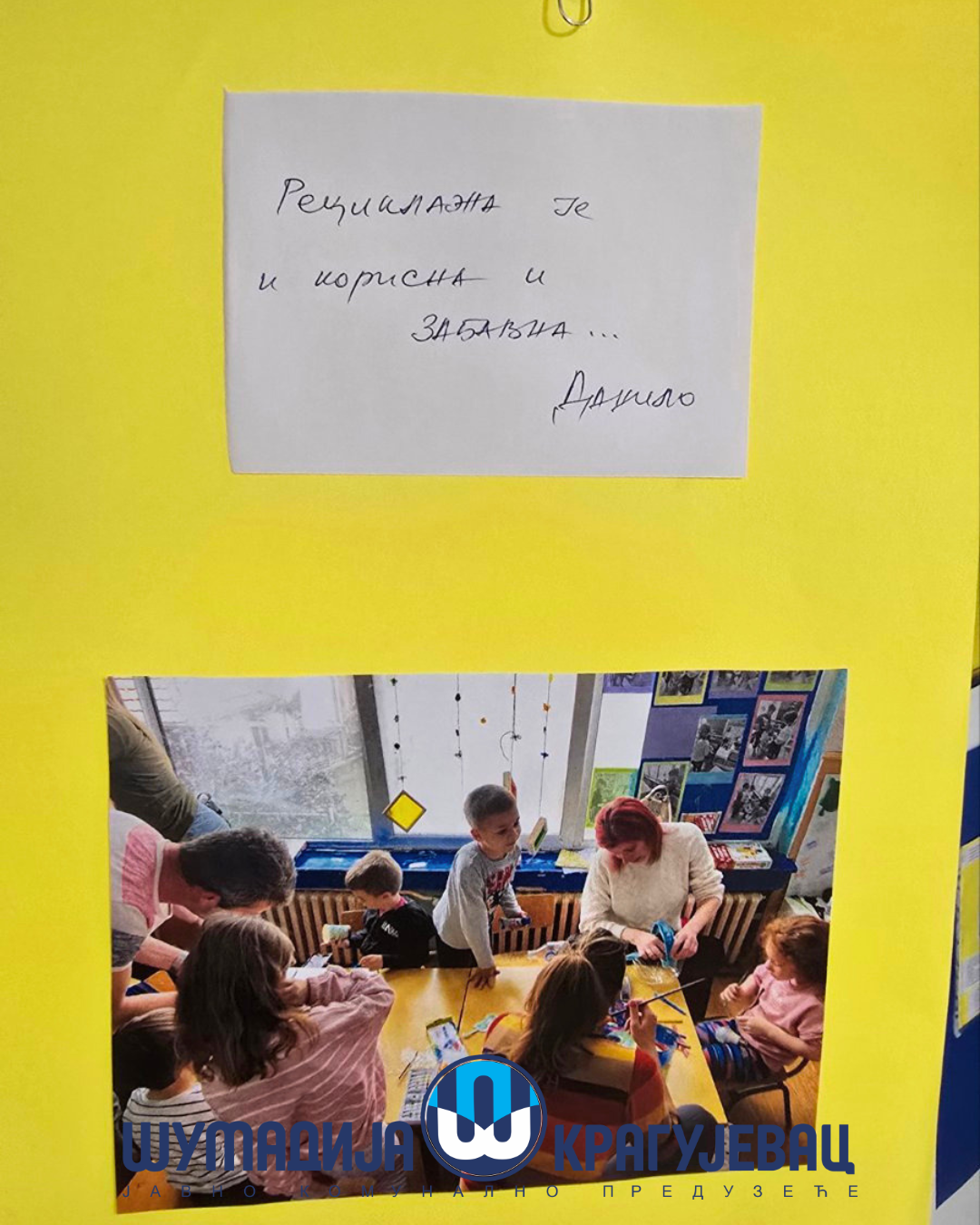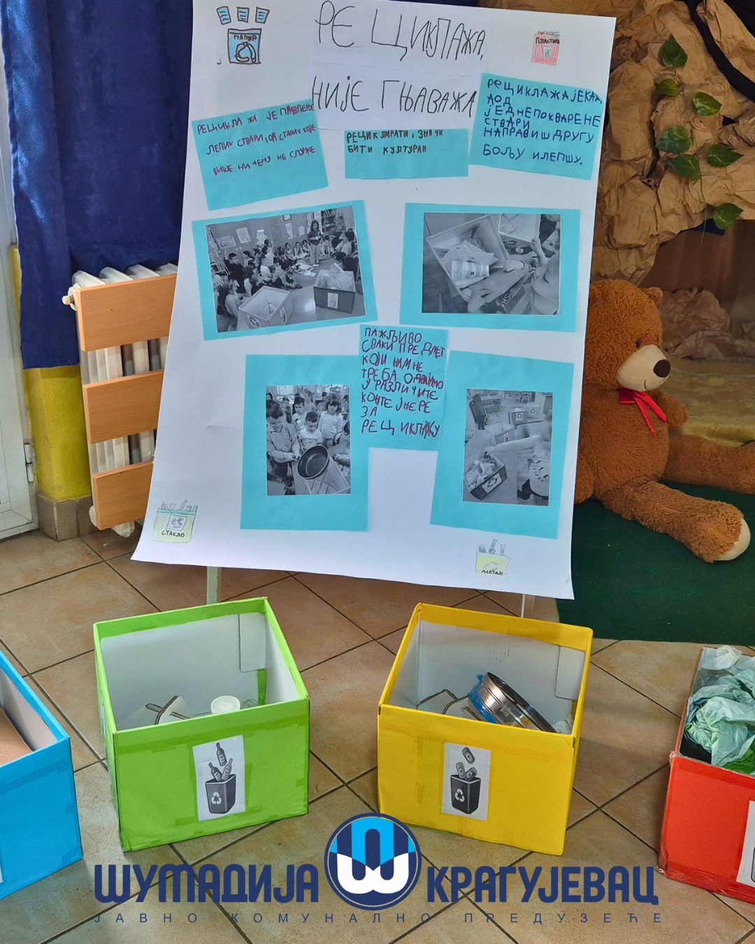 U saradnji sa predškolcima vrtića „Lane“ i „Sunce“ kreativnu ekološku radionicu o reciklaži održali su predstavnici JKP Šumadija Kragujevac. Mališani su imali priliku i da prisustvuju zanimlјivom predavanju predstavnika Centra za promociju zdravlјa Instituta za javno zdravlјe Kragujevac o značaju očuvanja životne sredine i važnosti obeležavanja Dana planete zemlјe.