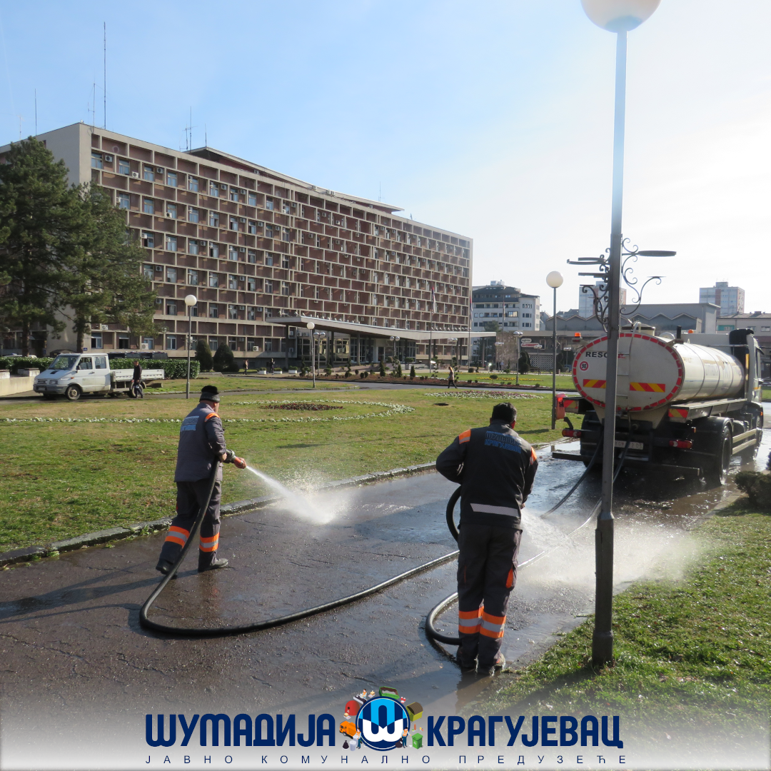 Служба јавне хигијене ЈКП Шумадија Крагујевац данас врши прање улице Др Зорана Ђинђића и платоа код РК Београд а јуче су опране стазе испред Скупштине града и на Тргу слободе.
