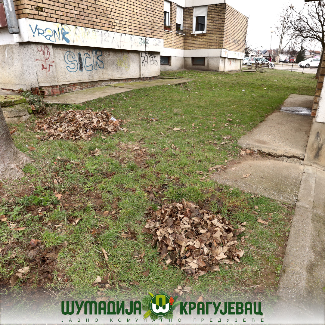 Sektor zelenilo JKP Šumadija Kragujevac u naselju Centralna radionica izvodi radove na grabuljanju i čišćenju lišća sa zelenih površina i iz žive ograde.