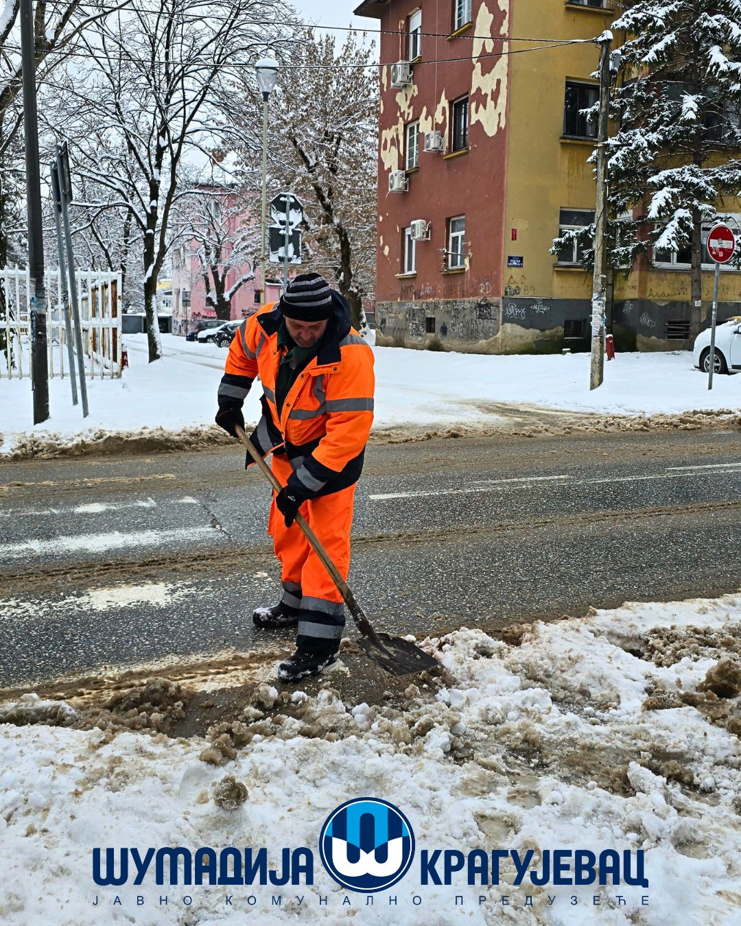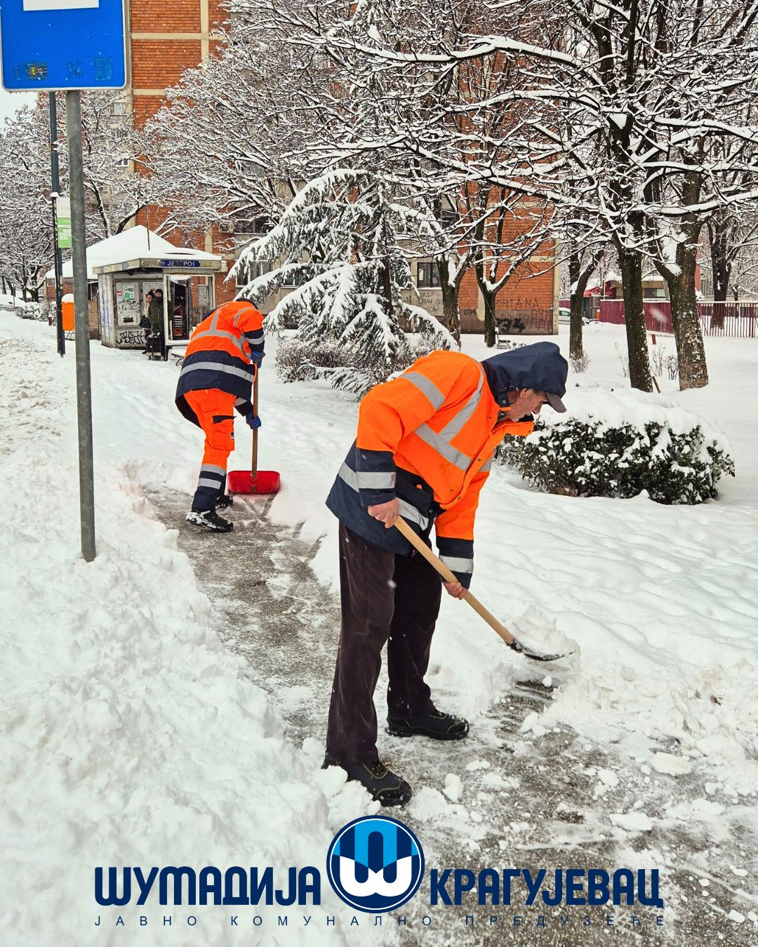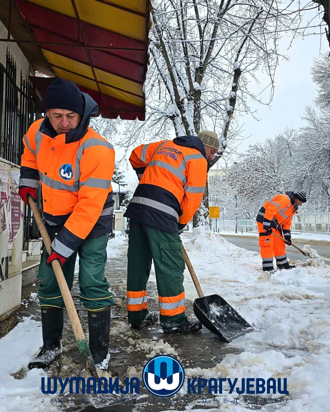 Zimska služba JKP Šumadija Kragujevac tokom noći i jutra angažovana je na obezbeđivanju prohodnosti saobraćajnica na gradskom i seoskom području, kao i na uklanjanju snega sa trotoara, nadvožnjaka, mostova i pešačkih staza.